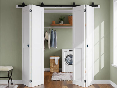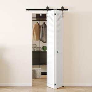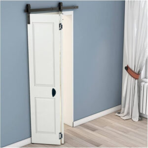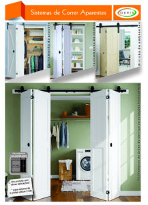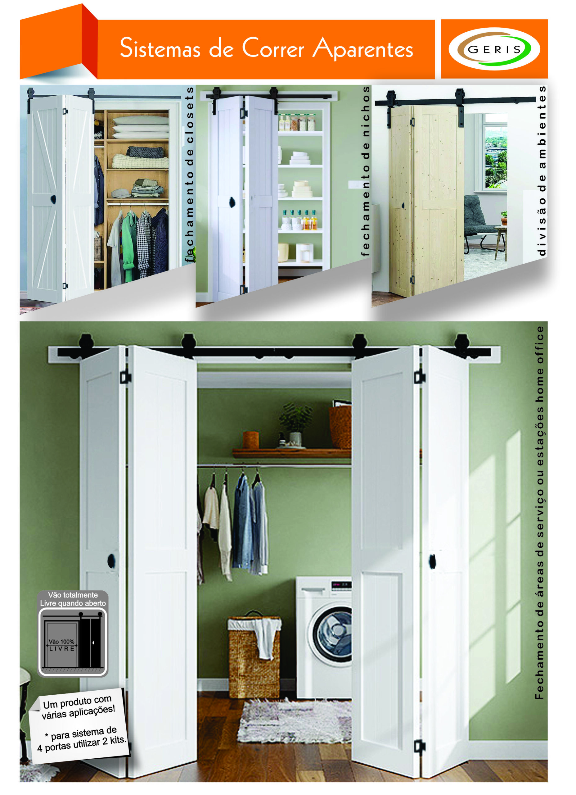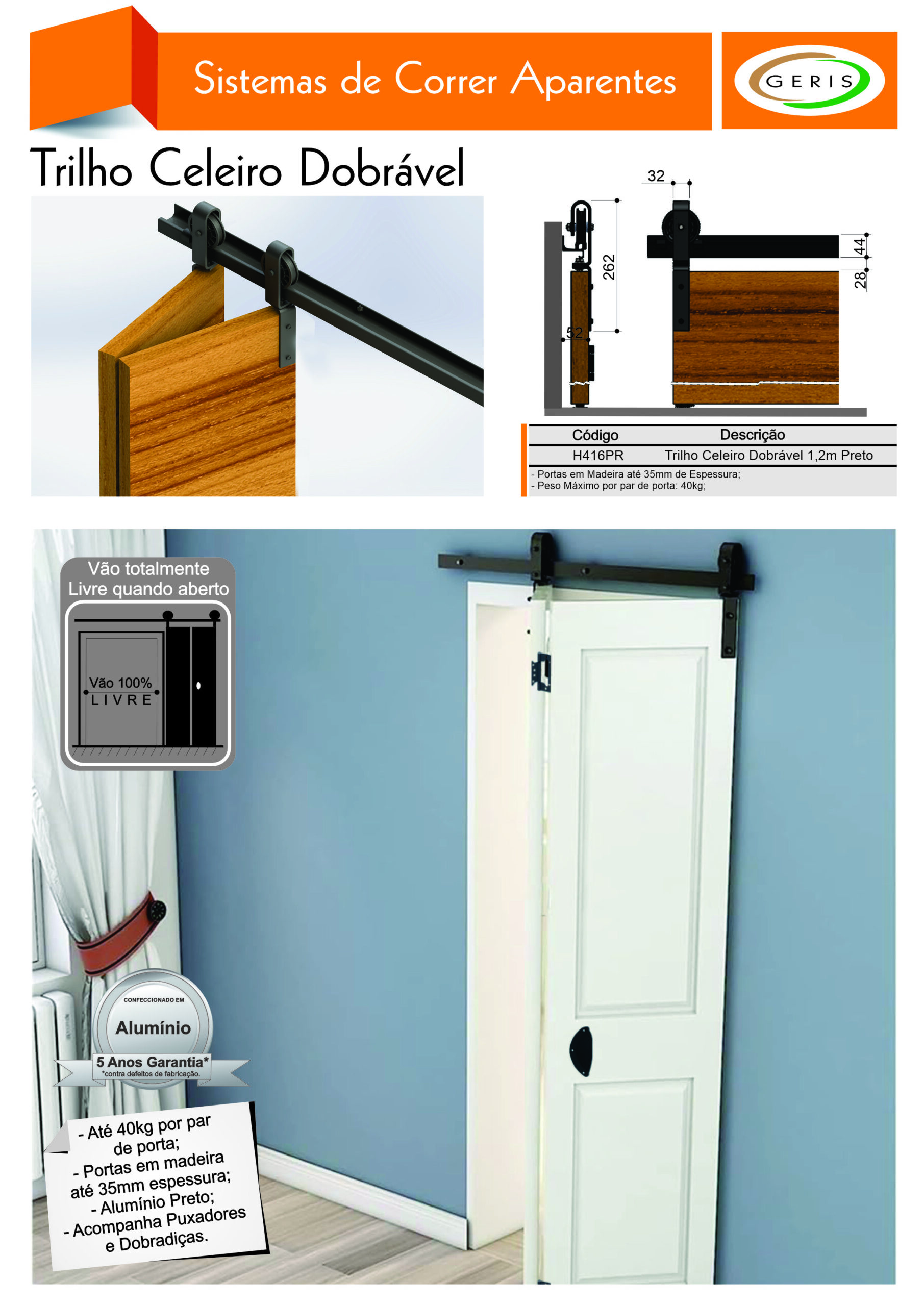 Sistema de correr aparente, em alumínio para portas em madeira. Disponível no acabamento preto fosco com comprimento único de trilho (1200mm). O sistema, quando aberto, deixa o vão totalmente livre. O puxador concha e dobradiças de sobrepor acompanham o kit.